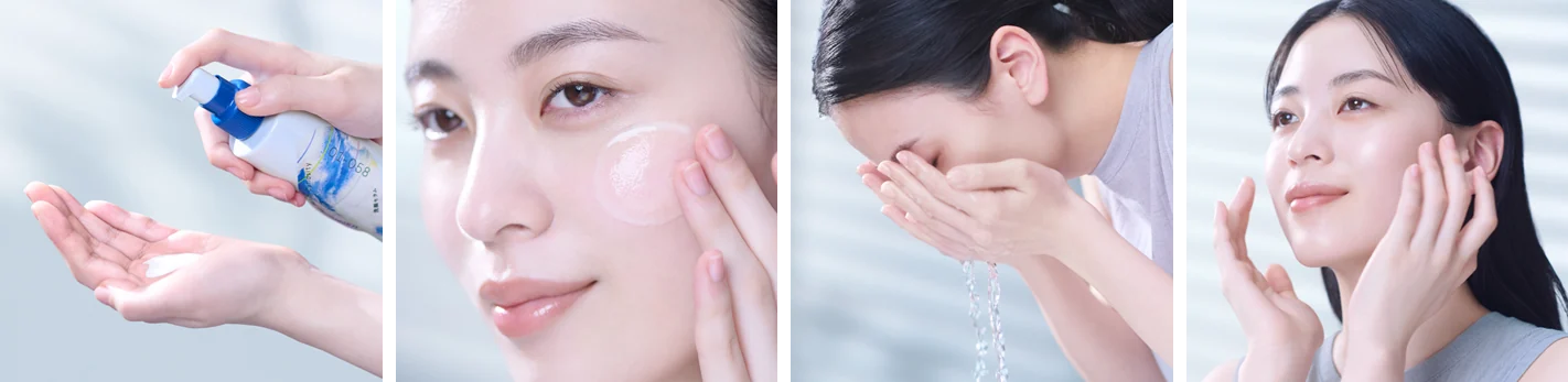 ●Rinse off with cool or lukewarm water, lightly gliding the water over your skin. (When the serum feels lighter in texture while washing, rinsing is complete.)