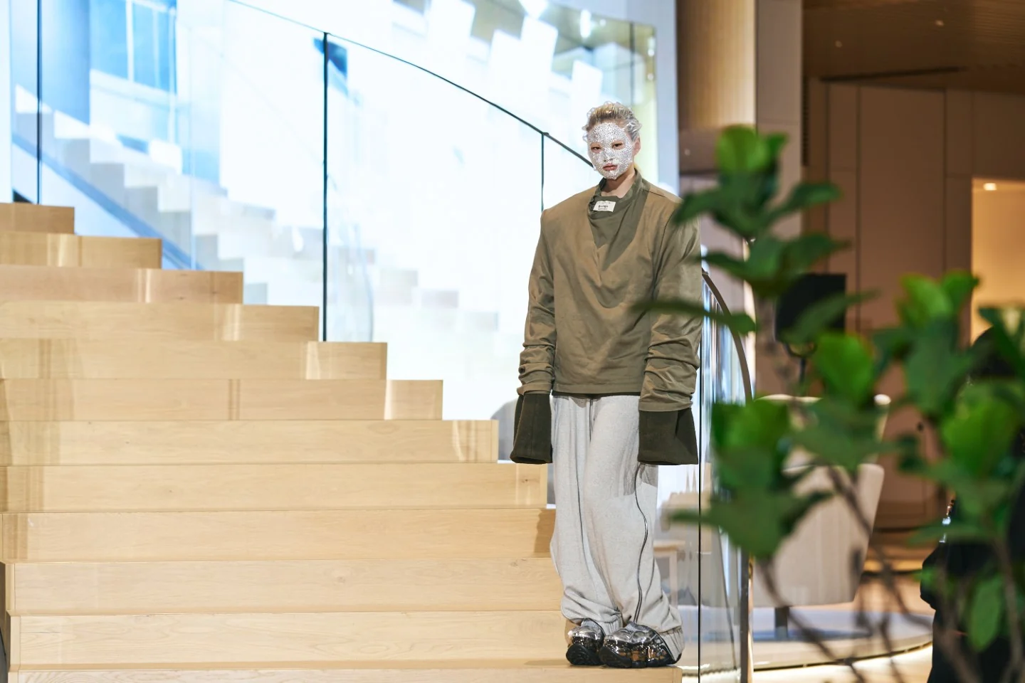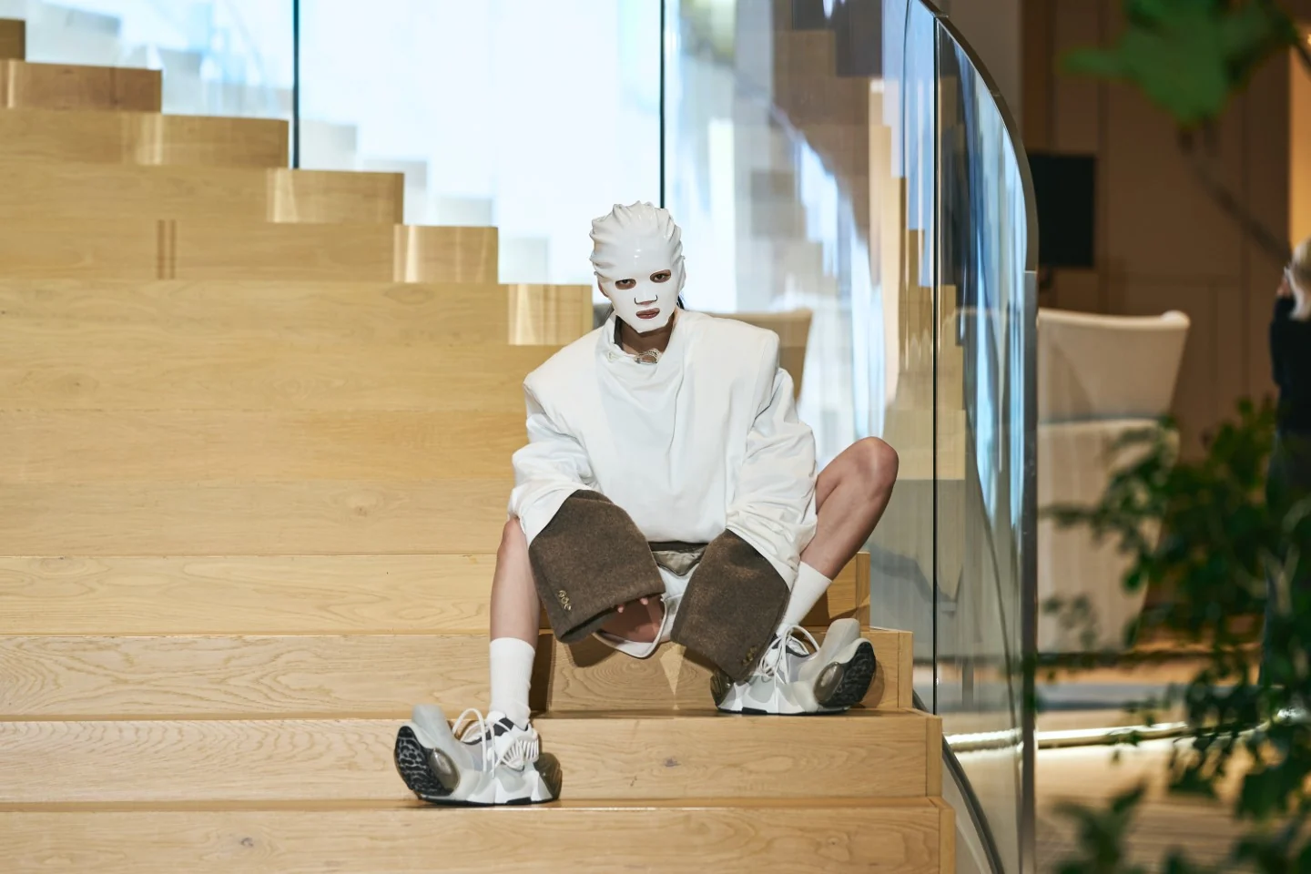 The transparent masks that covered the head and face, along with hair accessories resembling filaments, were the first thing to catch the audience’s eye. Next, focus was drawn to the footwear from grounds, which featured their signature design with transparent chunky soles.