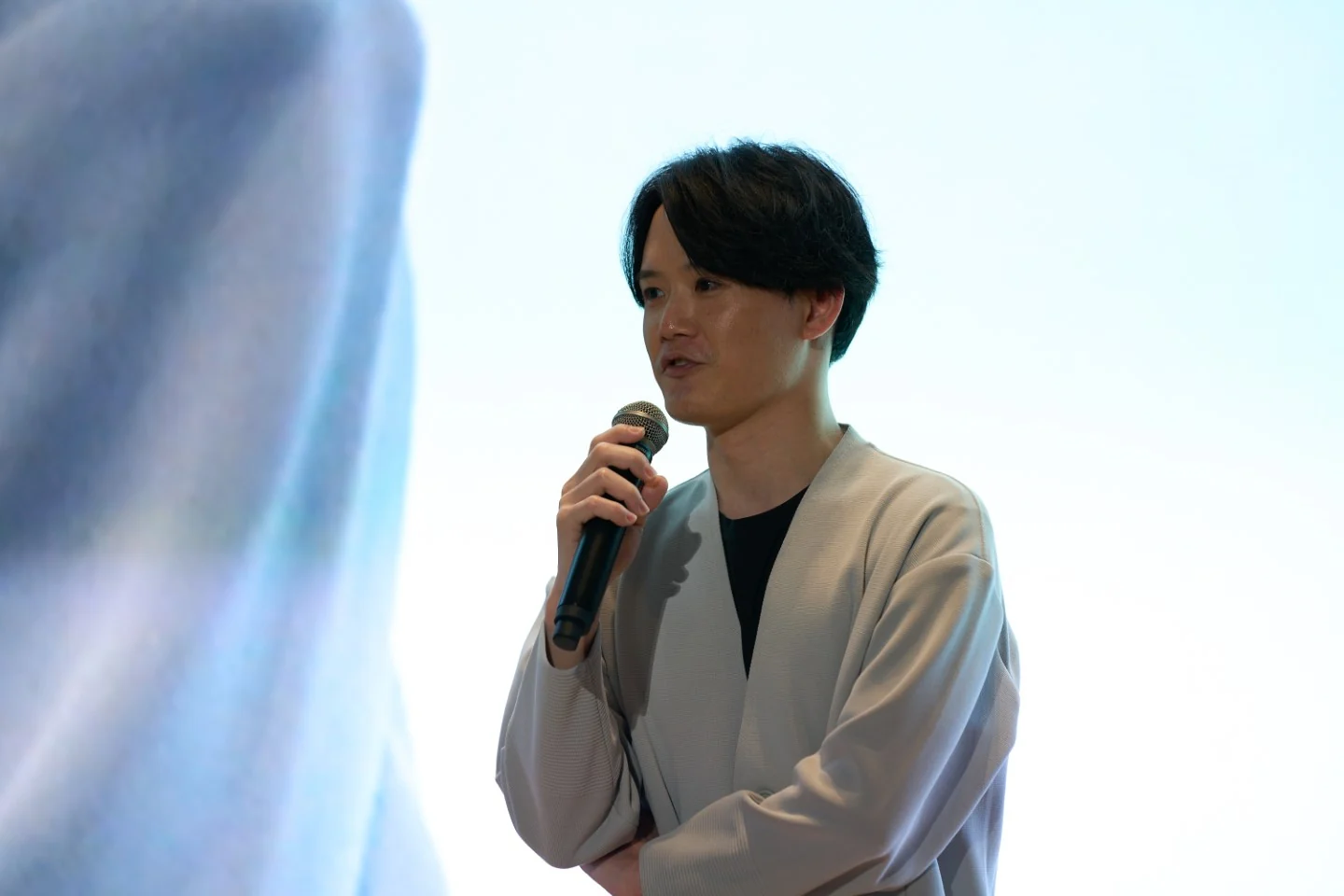ショーの最後に登壇したのは、スキンアクセサリーのチームで技術開発を担当する研究員、貞神喜郎。貞神は、来場した観客やショーに携わった関係者への感謝と、自分の思いを伝えた。