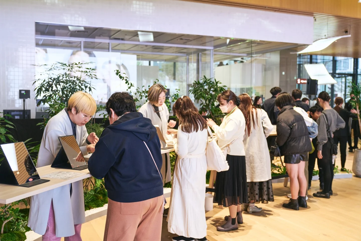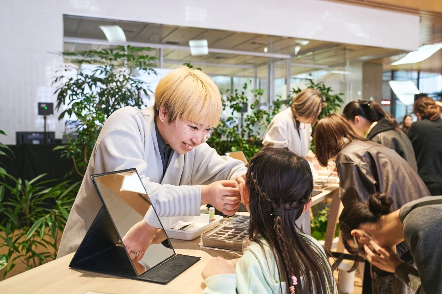 パールやクリスタル、ホログラムなど好きなパーツを選び、セカンドスキンを用いた2つの基剤で顔や肌に貼り付ける。世代や性別を越えた多様な人々が、いつものメイクとは一線を画すビューティー体験に目を輝かせていた。